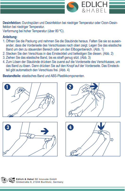 Der latexfreie Venenstauer mit breitem Elastikband, ist mit einem patentierten Kunststoffverschluss ausgestattet. Dieser ist so konzipiert, dass eine Einhand-Bedienung möglich ist. Nach Bedarf kann der Druck sofort aufgebaut oder gelöst werden.